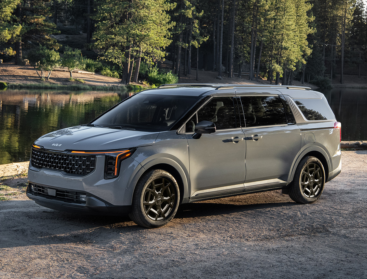 The 2026 Kia Carnival carries over after a refresh from last year. Notable features include a grand sculptural grille, intricately detailed cube-like headlights, Kia’s signature Star Map lighting in the front and rear, and geometric wheel designs ranging from available 17- to 19-inches. Available interior features include panoramic dual 12.3-inch displays and VIP Lounge Seats with heating, ventilation, and one-touch relaxation mode. Wireless Apple CarPlay® and Android Auto™ are standard. Carnival Hybrid has a 1.6L turbo-hybrid engine producing 242 hp. All models are available with the striking Dark Edition styling package.