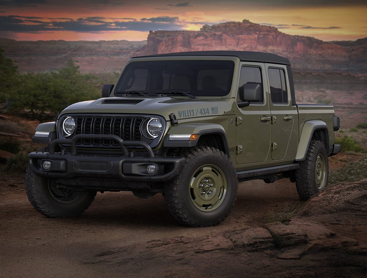 The Jeep Gladiator offers a variety of models and is equipped with a standard 3.6L V6 engine, an eight-speed automatic transmission, and a versatile cargo box. Gladiator delivers 4×4 max towing of up to 7,700 lb. A unique option is a fold-down windshield. The industry’s only open-air pickup truck offers a Dark Sky edition that features a performance hood to evoke the Desert-rated Mojave styling, body-color fender flares, gloss black bumper inserts, dark-colored badges and decals. For 2026, a new Willys ’41 Buzz model is offered that pays tribute to the Kaiser Jeep M715 military truck with rugged styling and exclusive content.
